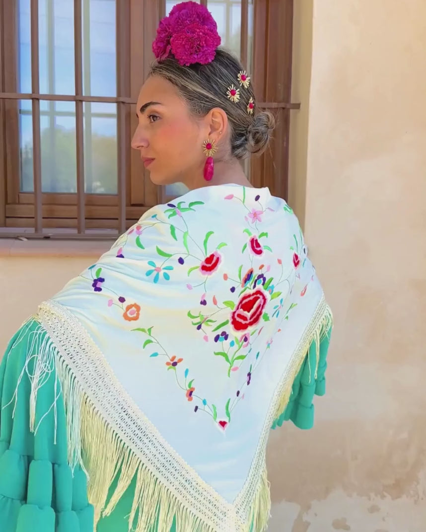 Mantón bordado de tamaño grande, perfecto para ponerlo de todas las formas posibles con tu traje o bata de flamenca: clásico, cruzado o remetido por el escote.