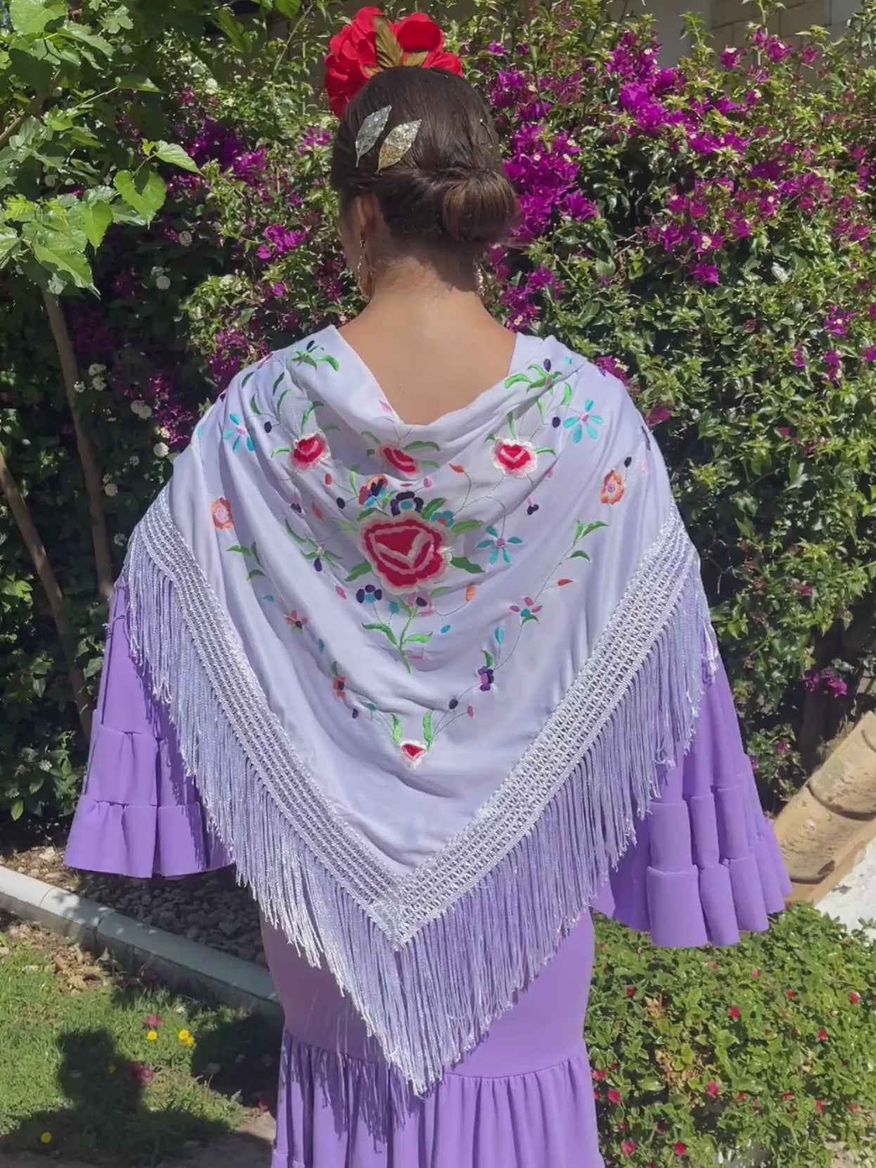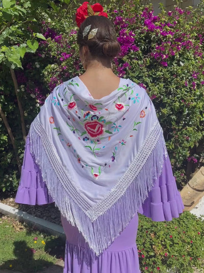Mantón bordado de tamaño grande, perfecto para ponerlo de todas las formas posibles con tu traje o bata de flamenca: clásico, cruzado o remetido por el escote.