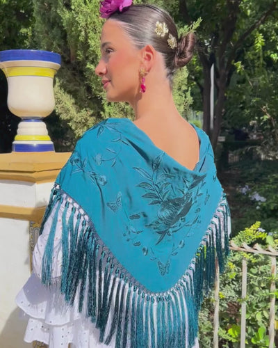 Los mantoncillos de flamenca KORALTI petróleo monocolor desprenden elegancia y sobriedad. Con flecado artesanal en seda natural y acabado impecable, son una opción atemporal y versátil que combina con todo tipo de trajes de flamenca.