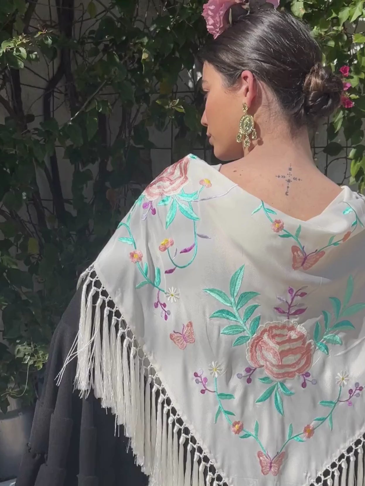 Mantoncillo 'Koralti' flecado en seda Beige con Flores Rosas