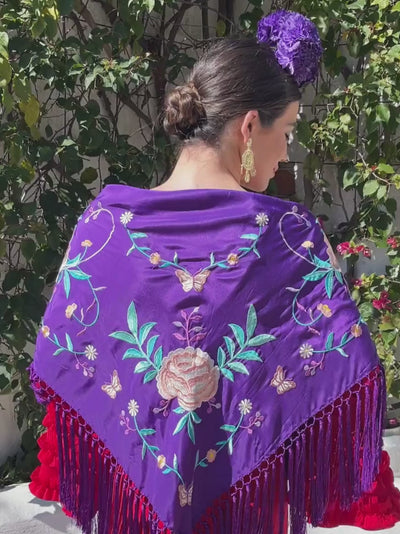 Mantoncillo 'Koralti' flecado en seda Morado con Flores Rosas