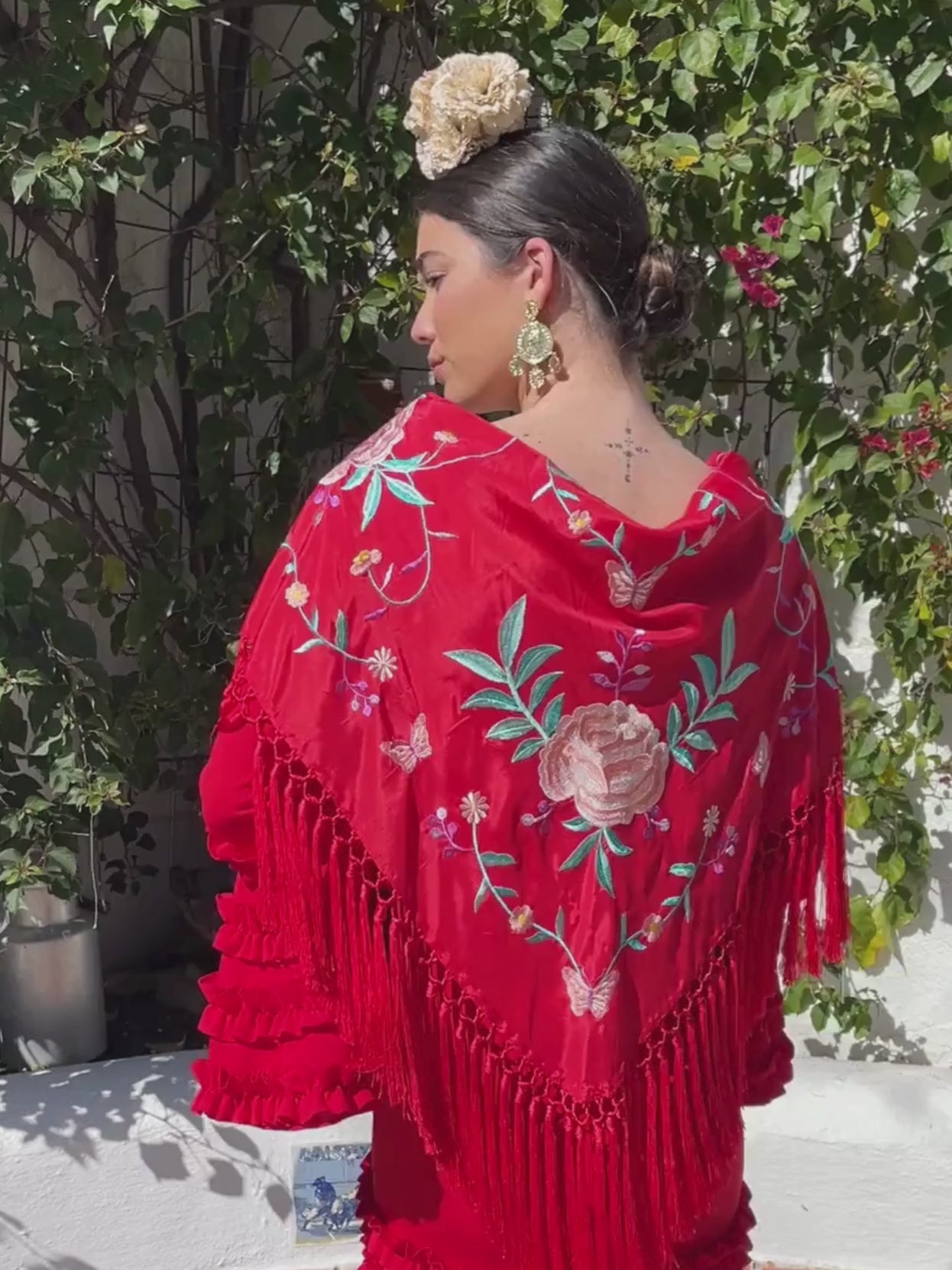 Mantoncillo 'Koralti' flecado en seda Rojo con Flores Rosas